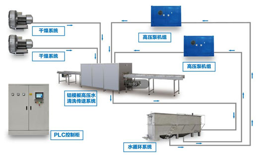 工人先由電控柜的觸摸屏開啟高壓泵組,并將壓力調(diào)至使用壓力。再由觸摸屏,操控傳送線啟動。當滾輪轉(zhuǎn)動后,由工人將待清洗的鋁模板放至傳送線上。在傳送線的傳送下,經(jīng)過清洗區(qū)域,由清洗盤噴射出的高壓水進行清洗。再經(jīng)過過渡區(qū)域的控水后,進入干燥區(qū)域由羅茨風機進行風干。清洗好的鋁模板傳送出干燥區(qū)域,由工人搬運至存放處。